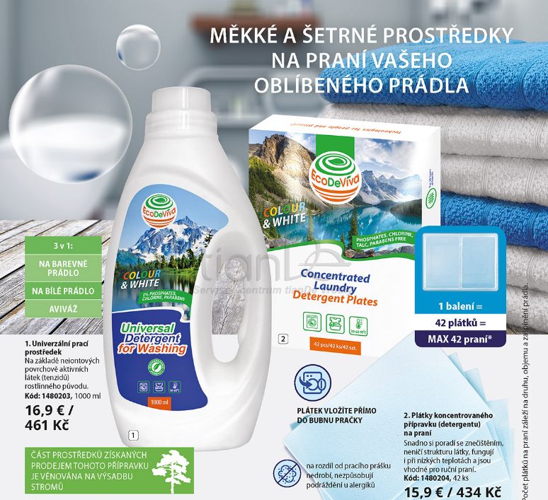 Šetrné a účinné pranie teraz aj v kompaktnom formáte. Tenké, ľahučké plátky koncentrovaného prípravku (detergentu) na pranie na báze neiónových povrchovo aktívnych látok rastlinného pôvodu – produkt so zvýšenou šetrnosťou k životnému prostrediu, neobsahuje fosfáty, chlór, mastenec ani parabény.