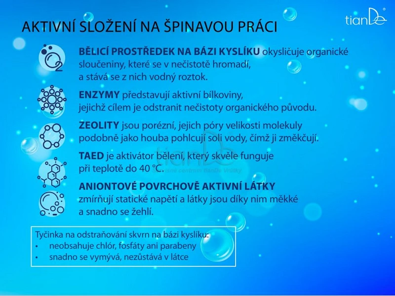 Univerzálny odstraňovač škvŕn na báze fytoenzýmov, zeolitov a aktívneho kyslíka rýchlo a účinne odstraňuje odolné škvrny od vína, kávy, čaju, kečupu, tuku, jódu, brilantovej zelene, rúžu, sadzí, krvi, atramentu a , , interiéru automobilov, mäkkých podláh.