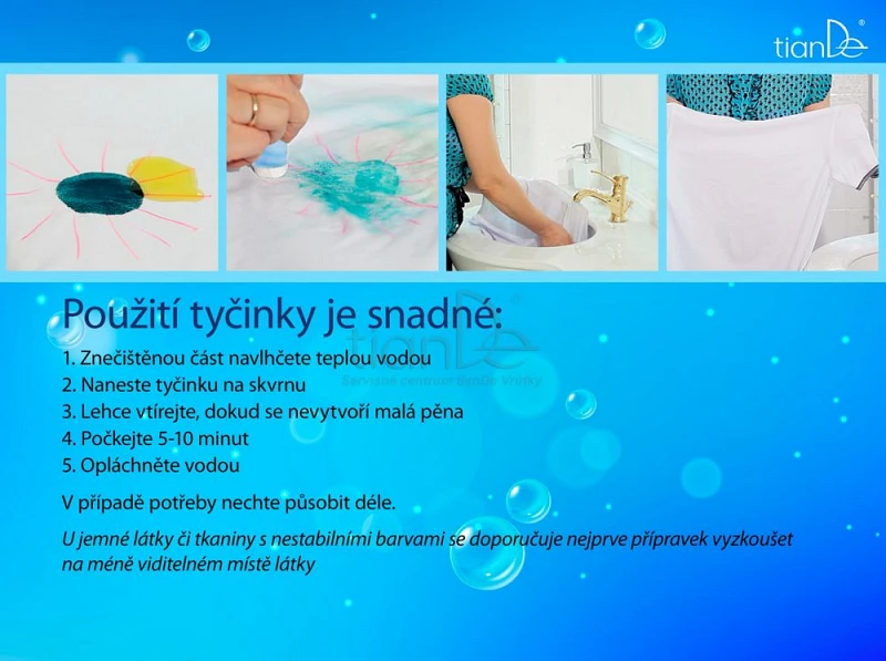 Znečistenú oblasť navlhčite teplou vodou, naneste odstraňovač škvŕn, zľahka vtierajte, kým sa nevytvorí biela pena, počkajte 5-10 minút, potom opláchnite vodou. V prípade potreby predĺžte dobu pôsobenia. Pri tkaninách s nestabilnými farbami je potrebné odstraňovač škvŕn najprv vyskúšať na skrytom mieste.