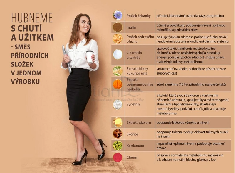 Zloženie: čakanka, prášok - 2 295 mg; cédrový orech, prášok - 405 mg; inulín – 144 mg; L-karnitín L-tartrát- 60 mg; extrakt blizny kukurice siatej– 60 mg; extrakt pomarančovníka horkého (s obsahom synefrínu 10 %) - 16,5 mg, extrakt zázvoru – 12 mg; škorica, prášok - 4,5 mg; kardamon, prášok – 2,85 mg; chróm (pikolinát chromitý) – 18,6 µg (46,5 % RHP*). * Referenčná Hodnota Príjmu