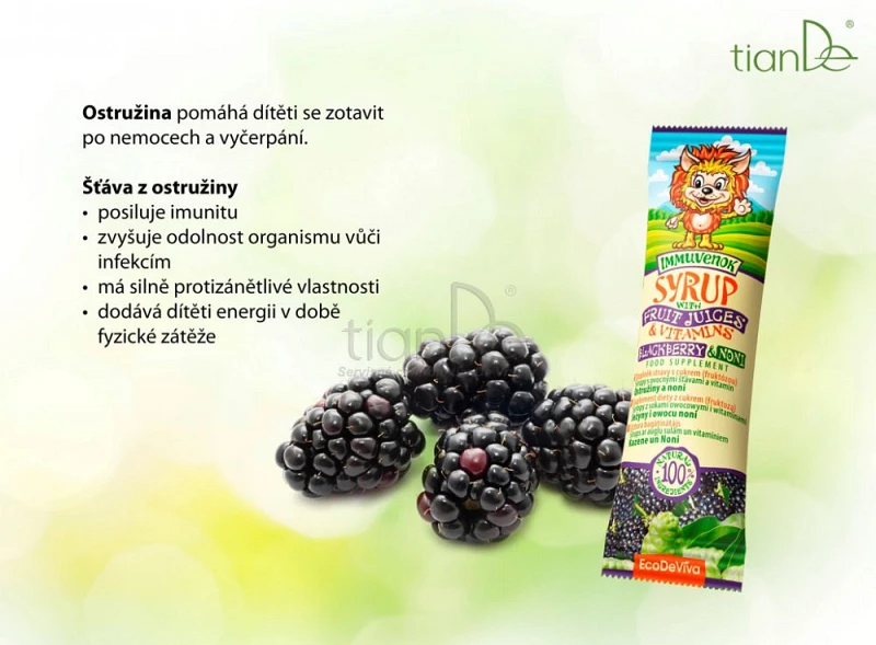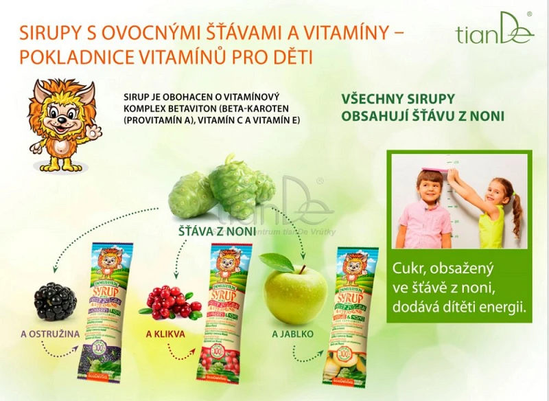 Sirupy s ovocnými šťavami a vitamínmi sú skvelým doplnkom zdravej, správnej a kvalitnej výživy detí. Sú 100% prírodné: bez konzervantov, zvýrazňovačov chuti, aromatizačných látok, pridaného škrobu a farbív. Nielenže sú zdravé, ale aj veľmi chutné a jemne kyselkavé.