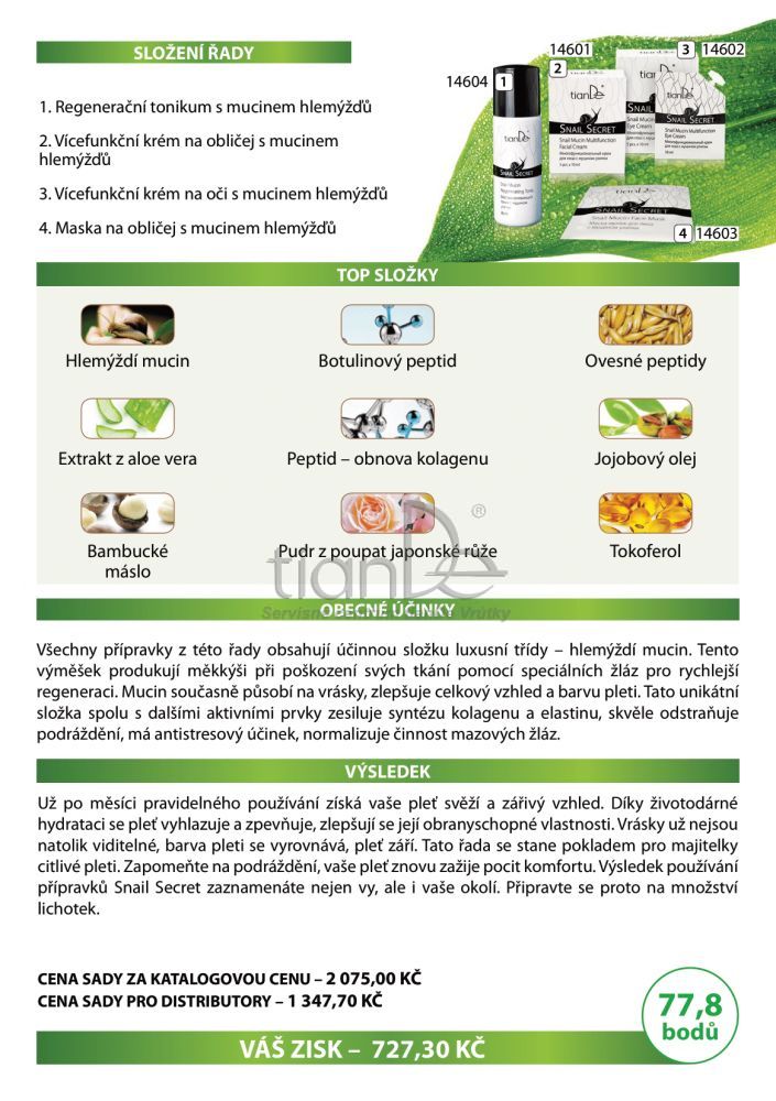 Podporuje obnovu buniek epidermy, vyhladzuje štruktúru pokožky, redukuje vrásky, spomaľuje proces starnutia pokožky. Chráni proti poškodeniu a podráždeniu. Základom krému je slimačí mucín (sekrét slimákov), ktorý obsahuje obrovské množstvo cenných kozmetických zložiek: kolagén, elastín, vitamíny A, C, E, kyselinu hyalurónovú a iné.