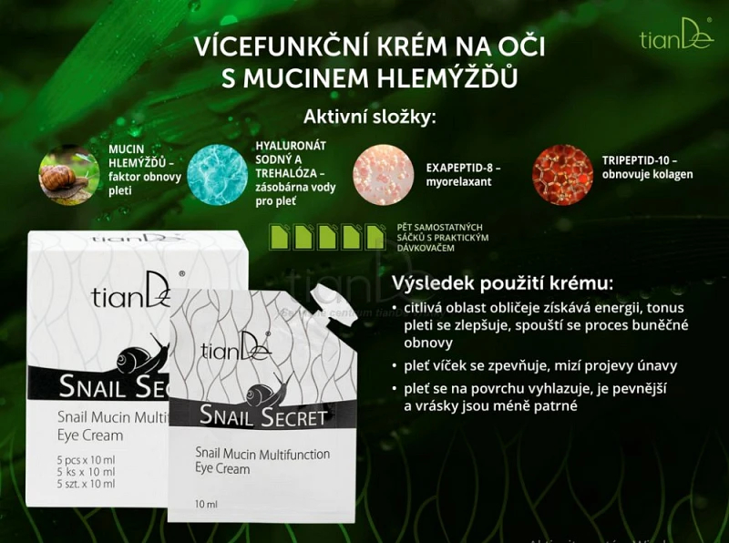 Zloženie obsahuje: mucín, botoxu podobný peptid, peptid pre rekonštrukciu kolagénu, jojobový olej, hyaluronát sodný.