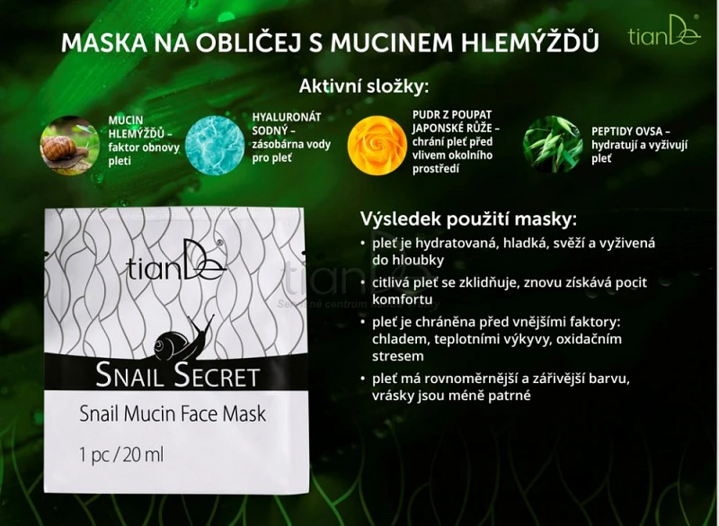 Základom krému je slimačí mucín (sekrét slimákov), ktorý obsahuje obrovské množstvo cenných kozmetických zložiek: kolagén, elastín, vitamíny A, C, E, kyselinu hyaluronovú a ďalšie. Vhodné pre všetky typy pleti a vekové kategórie.