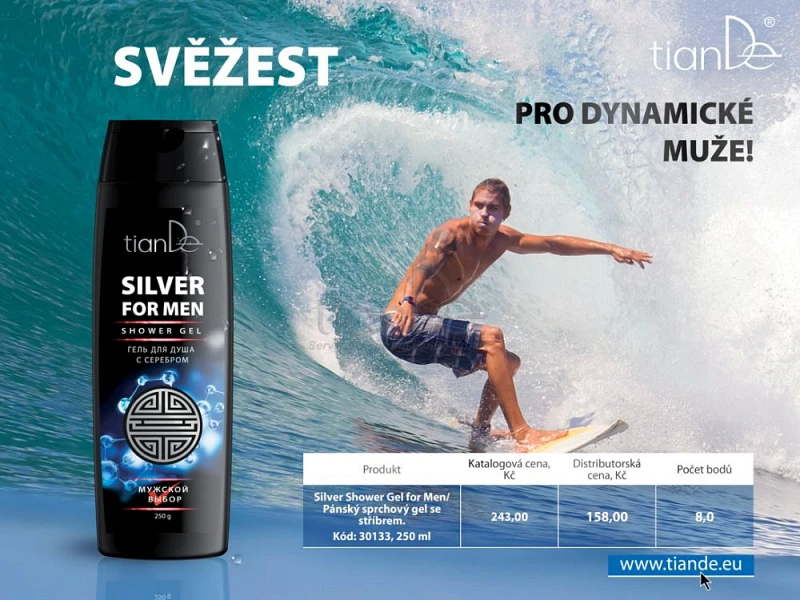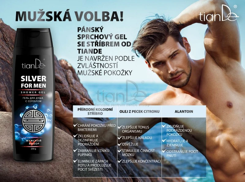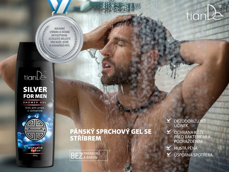 Sprchový gél bol vytvorený s ohľadom na vlastnosti mužskej pokožky. Prípravok obsahuje dezinfekčné a baktericídne koloidné striebro, ktoré ničí mikroorganizmy a zabraňuje vzniku nepríjemného zápachu, zaisťuje dlhodobý dezodoračný efekt. Taktiež v kombinácii s ďalšími aktívnymi zložkami gélu striebro odstraňuje podráždenie pokožky a zjemňuje ju.