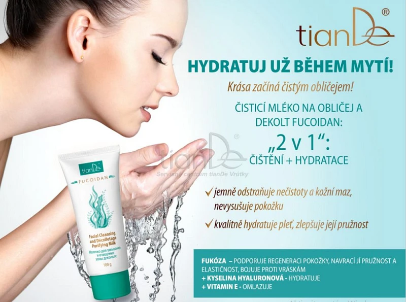 Čistiace mlieko na tvár a dekolt Fucoidan od TianDe jemne a šetrne odstraňuje zvyšky make-upu a nečistôt, zanecháva pritom príjemný pocit hydratácie a komfortu.