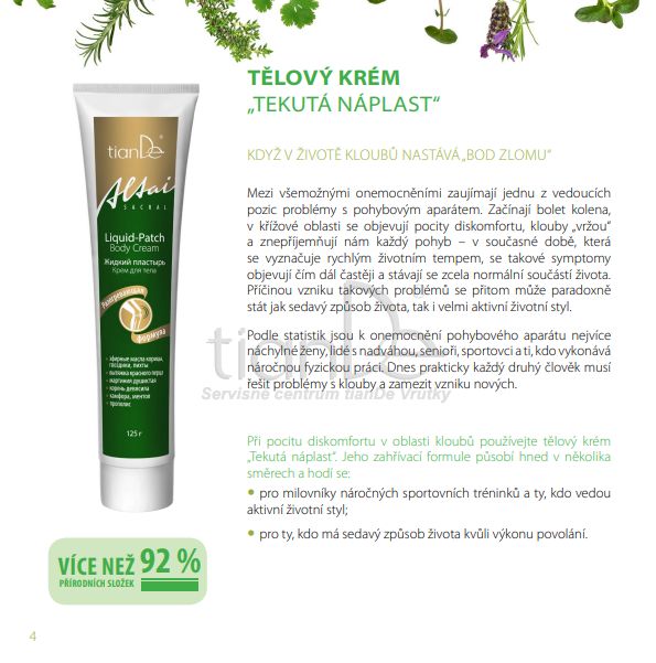 Krém "Tekutá náplasť" od TianDe sa ideálne hodí ako pre milovníkov aktívnych tréningov, tak aj pre tých, ktorí pred posilňovňou dávajú prednosť gauču (alebo sú nútení mať sedavý životný štýl kvôli práci). Vďaka obsahu aktívnych zložiek má silný zahrievací účinok.