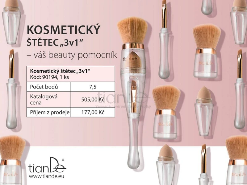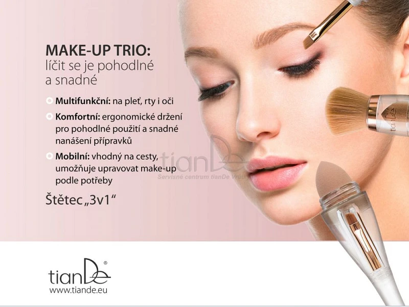 Hubku na tónovací základ, veľký štetec na púder, malý zase na rúž a obočie - pre ideálny make-up potrebujete desiatku rôzne veľkých štetcov, alebo - jediný štetec "3v1" od TianDe.